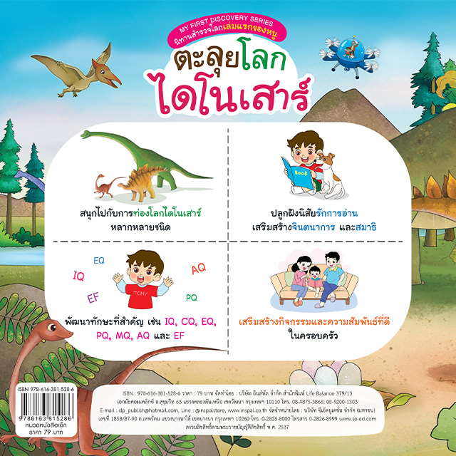 สนุกไปกับการท่องโลกไดโนเสาร์หลากหลายชนิด ด้วยนิทานตะลุยโลกไดโนเสาร์ ภาพวาดการ์ตูน สีสันสดใส กระตุ้นการเรียนรู้ ปลูกฝังนิสัยรักการอ่าน เสริมสร้างจินตนาการและสมาธิ พัฒนาทักษะด้าน IQ EQ PQ CQ SQ EF และทักษะอื่นๆ ที่จำเป็น อีกทั้งช่วยเสริมสร้างกิจกรรมและความสัมพันธ์ที่ดีในครอบครัว