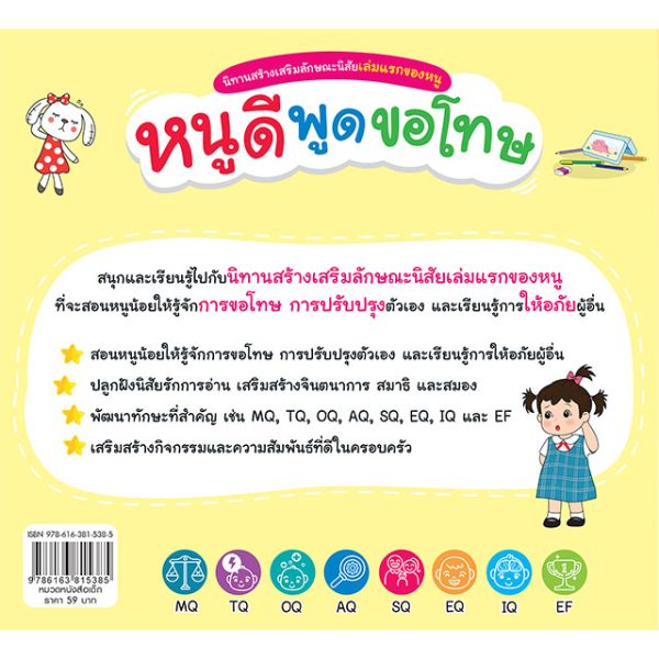 สนุกและเรียนรู้ไปกับนิทานสร้างเสริมลักษณะนิสัยเล่มแรกของหนู "หนูดีพูดขอโทษ" ที่จะสอนหนูน้อยให้รู้จักการขอโทษ การปรับปรุงตัวเอง และเรียนรู้การให้อภัยผู้อื่น ทั้งยังปลูกฝังนิสัยรักการอ่าน เสริมสร้างสมาธิ และจินตนาการ พัฒนาทักษะที่สำคัญ เช่น MQ, TQ, OQ, AQ, SQ, EQ, IQ และ EF ช่วยเสริมสร้างกิจกรรมและความสัมพันธ์ที่ดีในครอบครัว